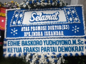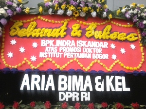 Karangan bunga tersebut berisi ucapan Selamat dan Sukses atas diraihnya Gelar Doktor oleh Indra Iskandar, Sekjen DPR RI.