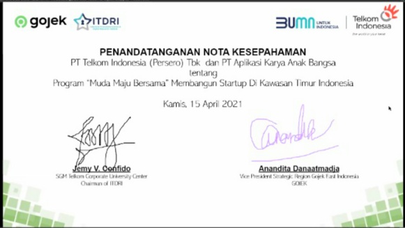 Program Muda Maju Bersama diresmikan pada hari ini melalui penandatangan Memorandum of Understanding (MoU) antara Gojek dan Telkom yang dilakukan oleh VP Strategic Regional Gojek Indonesia Timur, Anandita Danaatmadja bersama SGM Telkom Corporate University yang juga menjadi Chairman of ITDRI, Jemy V. Confido dengan wilayah program yang meliputi Kalimantan, Sulawesi, Maluku dan Papua.