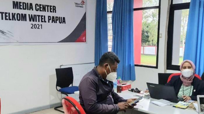 Keterangan foto : Jurnalis mengakses internet secara gratis di media center yang disediakan oleh PT. Telkom (Persero) di Kantor Witel Papua. Saat ini seluruh layanan TelkomGroup baik suara maupun data mulai dari fixed broadband IndiHome hingga mobile broadband Telkomsel telah up kembali dan dapat digunakan pelanggan secara prioritas sambil menunggu penyelesaian proses penyambungan kabel dengan menggunakan kapal khusus.