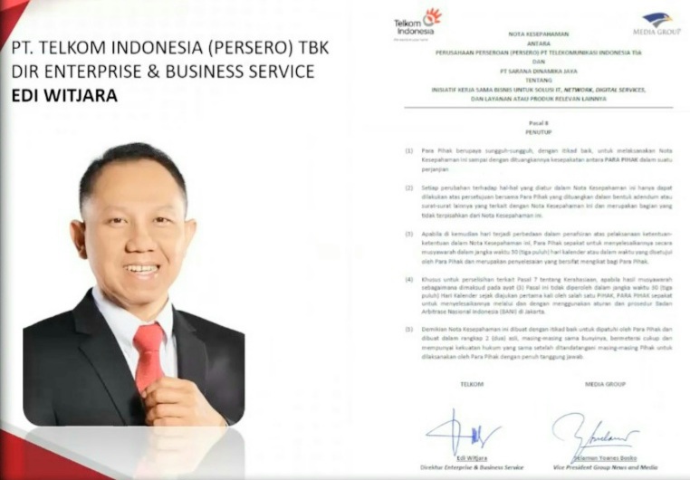 Jakarta. Seputar Nusantara. Dalam rangka memperkuat infrastruktur perkembangan bisnis di era digital, Direktur Enterprise & Business Service PT Telkom Indonesia (Persero) Tbk (Telkom), Edi Witjara melakukan penandatanganan Nota Kesepahaman tentang inisiatif kerja sama bisnis untuk solusi IT, Network, Digital Service, dan layanan maupun produk dengan Vice President Group News & Media PT Sarana Dinamika Jaya (Media Group) yang juga President Director Metro TV Don Bosco Selamun. Kegiatan yang dilakukan secara daring pada dua pekan lalu ini juga turut disaksikan oleh CEO Media Group Mohammad Mirdal Akib.