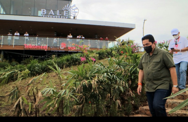 Keterangan foto : Menteri BUMN Erick Thohir (kiri) bersama Menteri Koperasi dan UKM Teten Masduki (kanan, berkaos putih) mengunjungi exclusive lounge Bale TelkomGroup di Bukit 360 Pertamina Mandalika International Street Circuit pada Sabtu (19/3).