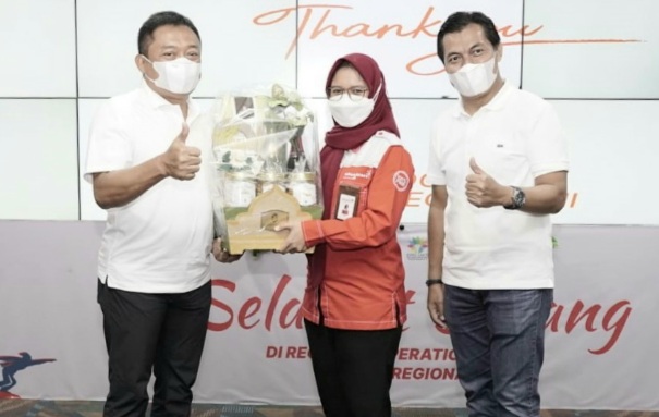 Keterangan foto : Direktur Utama Telkom Ririek Adriansyah (kiri) didampingi Executive Vice President Telkom Regional II Mohammad Salsabil (kanan) menyerahkan bingkisan apresiasi kepada perwakilan karyawan yang bertugas untuk memastikan kualitas layanan kepada pelanggan dan kesiapan produk serta layanan digital yang ditawarkan TelkomGroup selama bulan suci Ramadhan dan menuju Hari Raya Idul Fitri 1443 H di Witel Jakarta Timur, Rabu (13/4).
