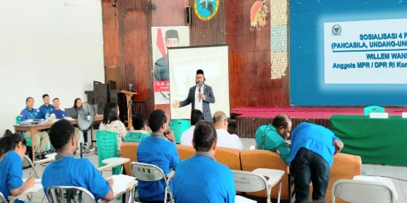 Keterangan foto : Anggota DPR/ MPR RI Willem Wandik, S.Sos., saat menyelenggarakan kegiatan Sosialisasi 4 Pilar MPR RI di Kota Jayapura- Papua, pada tanggal 1 Juli 2023