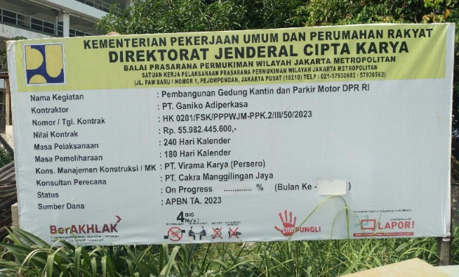 Keterangan foto : Plang Kegiatan Proyek Pembangunan Kantin dan Parkir Motor di Komplek DPR RI, Senayan- Jakarta