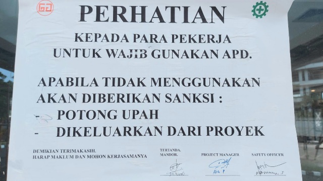 Keterangan foto : Papan tulisan peringatan kepada para pekerja untuk menggunakan APD (Alat Pelindung Diri) dan mengutamakan K3 (Kesehatan dan Keselamatan Kerja)