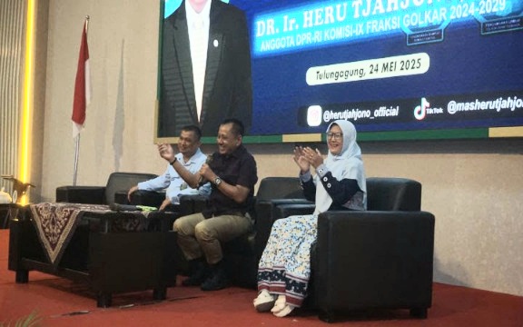 Keterangan foto : DR. Ir. Heru Tjahjono, MM., Anggota Komisi IX DPR RI dari Fraksi Partai Golkar (tengah), saat menjadi nara sumber dalam kegiatan Sosialisasi Program Peningkatan Kualitas Kesehatan Lingkungan di Tulungagung- Jawa Timur, pada Sabtu 24 Mei 2025