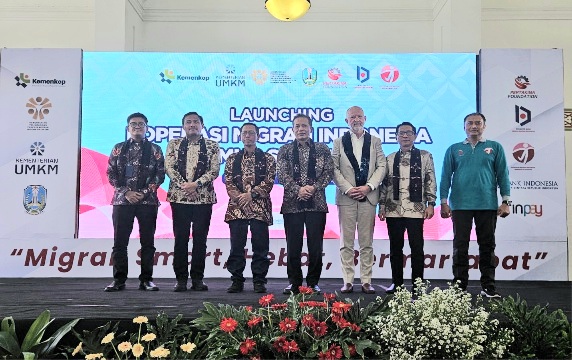 Keterangan foto : Wakil Menteri Koperasi RI Ferry Juliantono, Direktur Business & Marketing Finnet Aziz Sidqi, Komisaris Utama Finnet Difi Johansyah, Ketua Koperasi MIMS Anang Zunaedi, Direktur Kewirausahaan dan Pengembangan Usaha Produktif Kementerian Koperasi Sukarman, Kepala Dinas Koperasi Provinsi Jawa Timur Endy Alim Abdi Nusa, Deputi Kepala Bank Indonesia Jawa Timur Erwindo Kolopaking, dan Country Manager Indonesia PUM Netherland Gerard Wolbert saat penandatanganan Memorandum of Understanding (MoU) antara Finnet dengan Koperasi Migran Indonesia Makmur Sejahtera (MIMS)