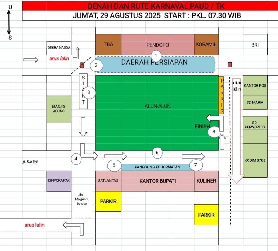 Keterangan foto : Rute Karnaval PAUD dan TK yang akan dilaksanakan pada hari Jumat 29 Agustus 2025 mulai pukul 07.30 WIB sampai dengan selesai.