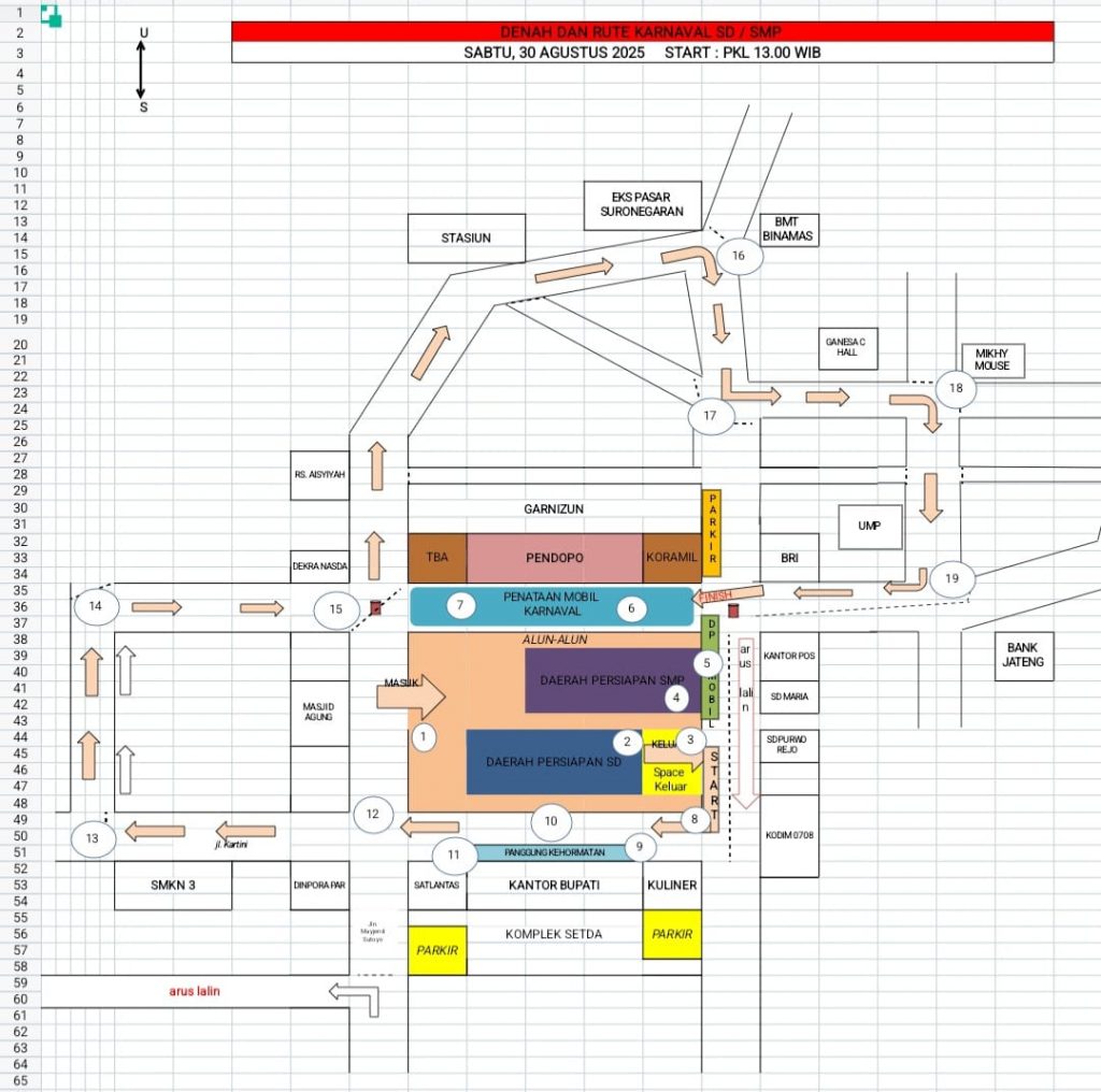 Keterangan foto : Rute Karnaval SD dan SMP yang akan diselenggarakan pada hari Sabtu tanggal 30 Agustus 2025 mulai pukul 13.00 WIB sampai dengan selesai.