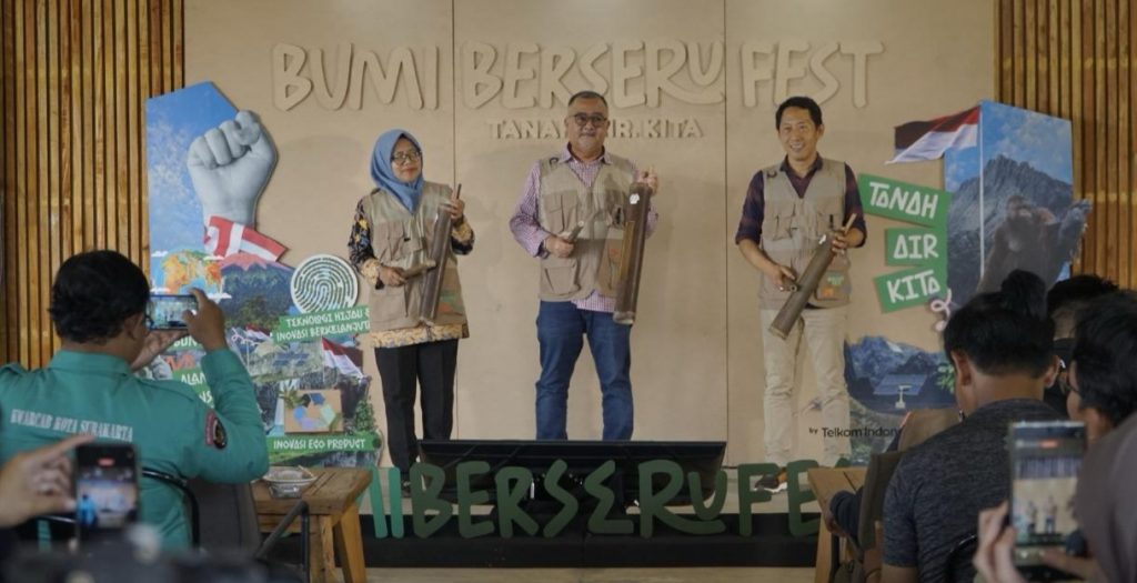 Keterangan foto : (kiri ke kanan) Ketua Tim Kerja Peningkatan Kapasitas Lingkungan Dinas Lingkungan Hidup Kota Surakarta, Prasetyaningsih Soewarno, S.P., M.Si., Deputi Pengendalian Perubahan Iklim dan Tata Kelola Nilai Ekonomi Karbon Kementerian Lingkungan Hidup (PPI TK NEK) Ir. Ary Sudijanto, M.S.E., dan Senior General Manager Social Responsibility Telkom Hery Susanto saat acara Grand Launching Bumi Berseru Fest (BBF) 2025 di Solo, pada Sabtu 23 Agustus 2025