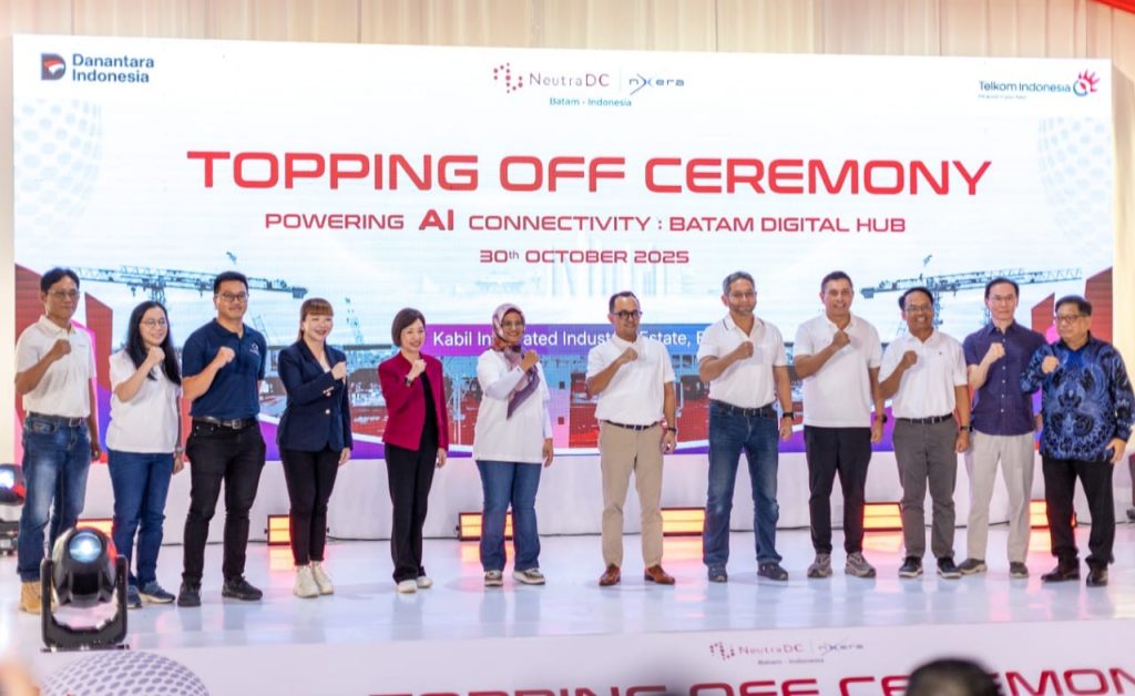 Batam. Seputar Nusantara. PT Teknologi Data Infrastruktur (NeutraDC Nxera Batam), anak usaha PT Telkom Indonesia (Persero) Tbk melalui anak usahanya, PT Telkom Data Ekosistem (NeutraDC), menggelar Topping Off Ceremony “Powering AI Connectivity: Batam Digital Hub” sebagai penanda pencapaian penting pembangunan Hyperscale Data Center NeutraDC Nxera Batam di kawasan industri Kabil, Batam, Kamis, 30 Oktober 2025. Fasilitas ini memiliki kapasitas awal 18 MW dan akan dikembangkan secara bertahap hingga 54 MW, menegaskan komitmen TelkomGroup dalam memperkuat infrastruktur digital nasional serta menjadikan Batam sebagai pusat konektivitas AI dan ekosistem data regional di Asia Tenggara.