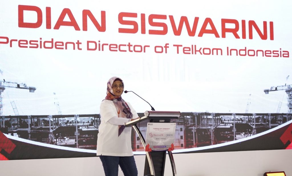 Keterangan foto : Direktur Utama Telkom Dian Siswarini saat memberikan paparan pada acara Topping Off Hyperscale Data Center (HDC) NeutraDC-Nxera Batam, Kamis 30 Oktober 2025 di Batam.