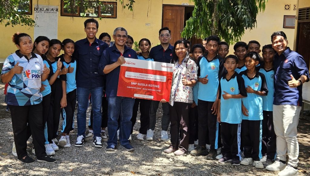 Keterangan foto : Penyerahan Bantuan 111.500 GB kuota internet Telkomsel kepada perwakilan SMP Susila Koting.