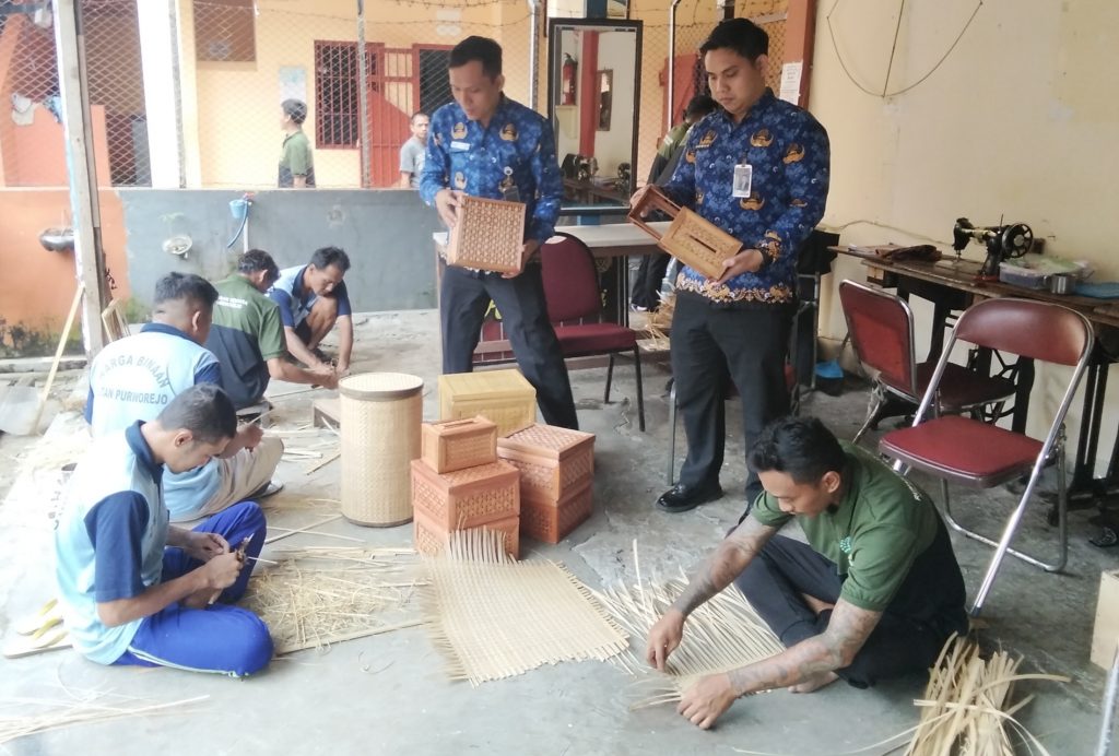 Keterangan foto : David Saptoaji Putra (berdiri kiri), Kepala Rutan (Rumah Tahanan Negara) Kelas IIB Kabupaten Purworejo- Provinsi Jawa Tengah, memegang hasil karya WBP berupa kerajinan tangan