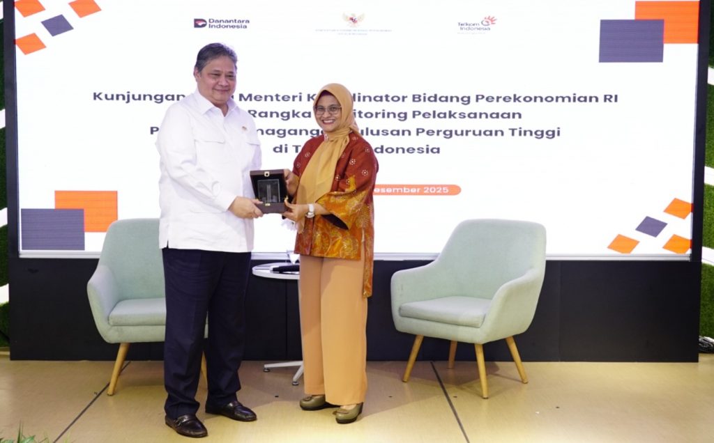 Keterangan foto : Direktur Utama Telkom Dian Siswarini (kanan) saat memberikan cinderamata kepada Menteri Koordinator Bidang Perekonomian RI (Menko Perekonomian) Airlangga Hartarto (kiri) saat acara monitoring pelaksanaan program pemagangan lulusan perguruan tinggi di lingkungan TelkomGroup yang berlokasi di Telkom Landmark Tower (TLT) Jakarta, pada Selasa 2 Desember 2025