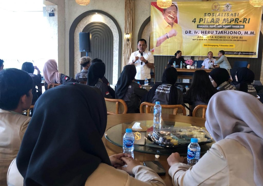 Keterangan foto : DR. Ir. Heru Tjahjono, MM , Anggota DPR/ MPR RI dari Fraksi Partai Golkar (Golongan Karya) menyelenggarakan kegiatan Sosialisasi 4 Pilar MPR RI dengan tema “Entrepreneurship sebagai Wujud Ketahanan Negara” di Tropical House, Tulungagung- Jawa Timur, pada tanggal 9 Desember 2025.