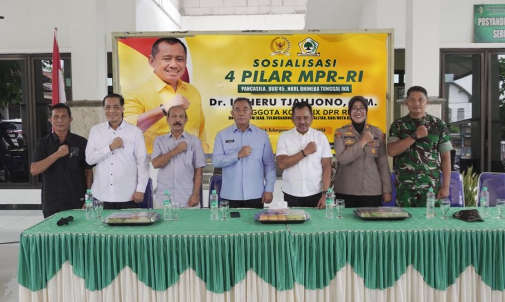 Keterangan foto : DR. Ir. Heru Tjahjono, M.M., Anggota Komisi IX DPR RI (ketiga dari kanan), bersama pejabat wilayah setempat saat di Desa Pucunglor, Kecamatan Ngantru, Kabupaten Tulungagung- Jawa Timur, dalam kegiatan Sosialisasi Empat Pilar Kebangsaan (4 Pilar MPR RI) pada Minggu, 8 Februari 2026.